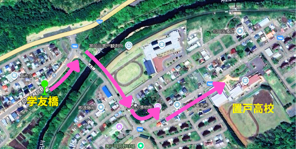 ※時刻表アプリでは置戸高校の最寄りバス停が『「置戸」で徒歩3分』と表示される場合がありますが、実際は『「学友橋」で徒歩7分』です。